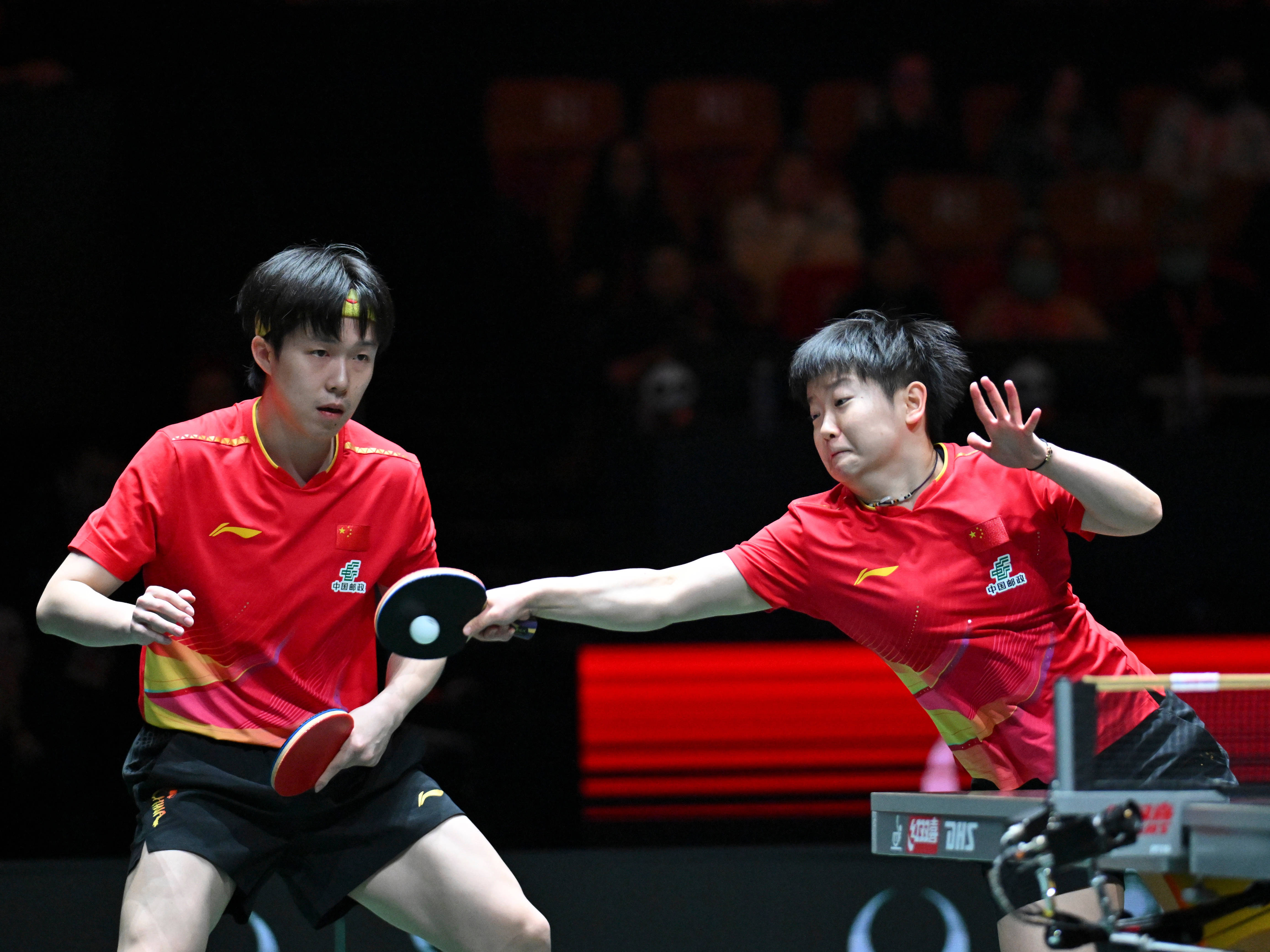 12月4日,中国队组合王楚钦/孙颖莎(右)在混双比赛中。新华社记者 胥冰洁 摄女单比赛,王曼昱对阵帕瓦德。王曼昱在攻防两头占据光显上风,她再下三局后中国队已取得大比分6:0跳跃。