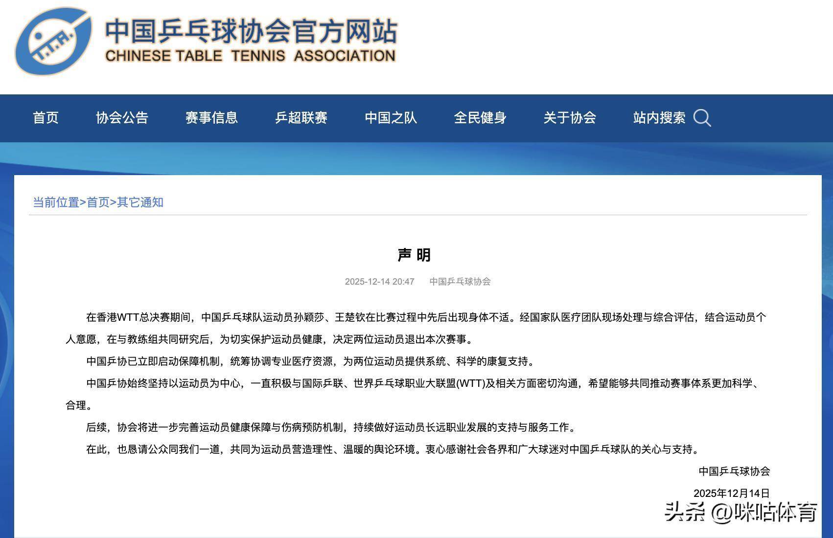 2025年12月14日,WTT香港总决赛男单半决赛演出令东谈主揪心一幕——国乒名将王楚钦因腰部剧痛难忍,赛前与敌手莫雷加德关爱拥抱致敬后,在解释王皓的搀扶下缺憾离场,无奈退赛。